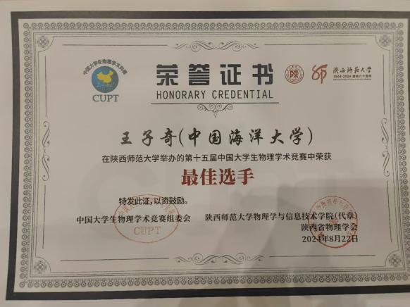 8月22日,第十五届中国大学生物理学术竞赛(CUPT)在陕西师范大学落下帷幕。名媛直播 代表队经过三天5轮15场的激烈角逐,勇夺国赛二等奖,获得明年国赛直通名额。名媛直播 代表队队长2022级物理学专业王子奇发挥稳健出色,以优异的成绩夺得国赛“最佳选手”个人奖项。
