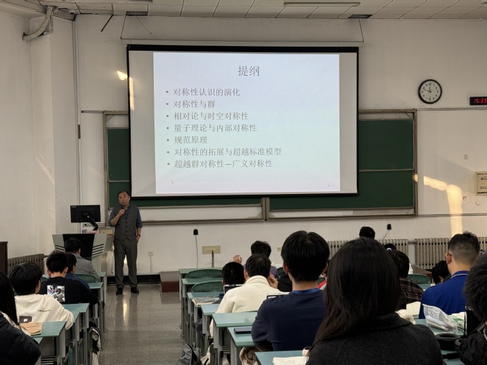 讲座中,薛迅教授重点围绕对称性与群理论,介绍了物理学关于对称性的发展历程和当前物理学领域的重要研究热点,讲述了相对论和时空对称性、量子理论和内部对称性的联系,深入解析了这些对称性在现代物理学中的核心作用并进一步拓展到超越标准模型的新物理和超越群对称性的前沿研究。