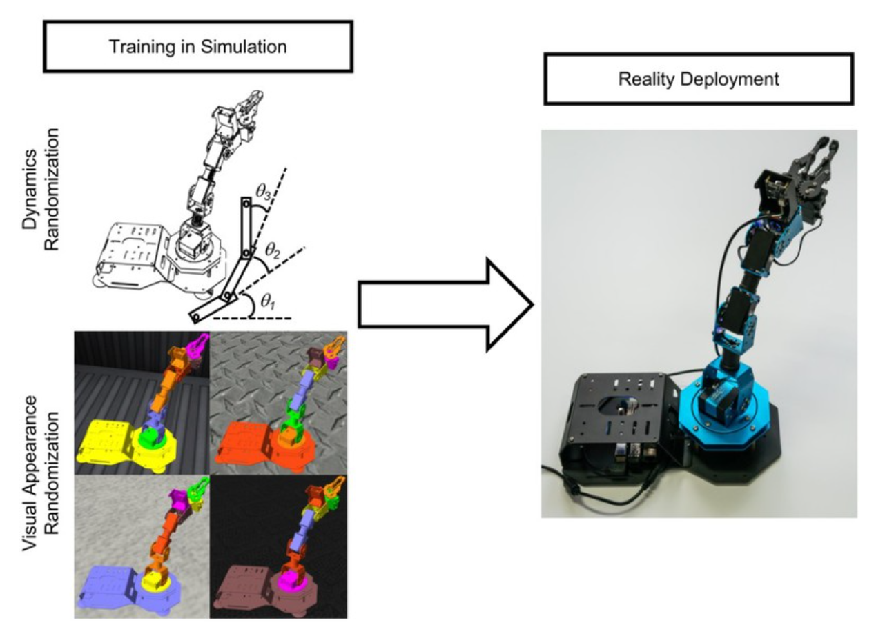 For example, to solve the problem of mismatch between observation states or dynamic models in virtual and real environments, domain randomization provides rich experience for training robot control strategies by randomly adding biases and noise to visual images and dynamic parameters, achieving one-time transfer from virtual policies to real environments.
