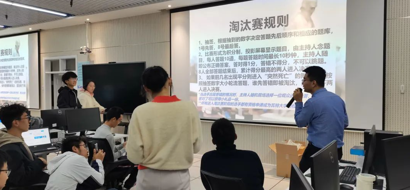 First up was the elimination rounds. After emphasizing the rules of the competition, the teacher drew lots with playing cards to determine the order in which each of the eight students would answer questions. The student who drew the card numbered one answered first, and the student who drew the card numbered eight answered last. Each contestant had 10 seconds to answer each of their 10 questions, and there was no interference or distraction allowed between participants. The two students with the highest number of correct answers advanced to the finals.