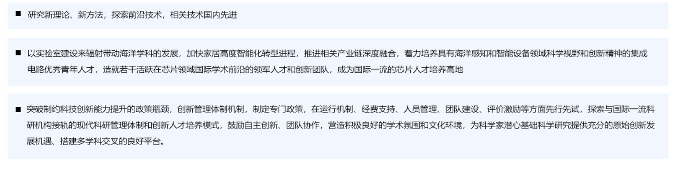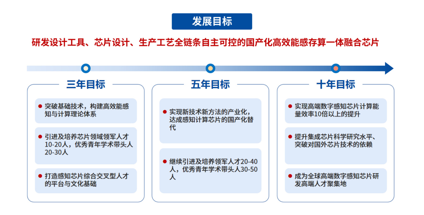 实验室致力建设全球领先的智能感知与集成芯片科学研究中心。发展目标包括三个方面: