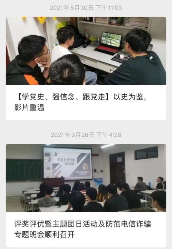 团支部积极贯彻落实“三会两制一课”,2021年开展支部团员大会、团支委会、团小组会共52次,落实好团员教育评议制度、团员年度团籍注册制度。同时团支委坚持发挥核心引领作用,细化“团小组管理”、“班团一体化管理”,以团小组为单位定期开展批评与自我批评,班主任积极参与支部组织建设,推进支部工作协调发展。