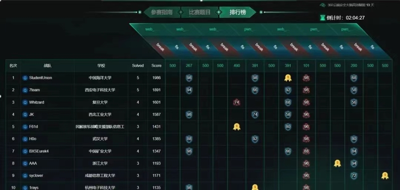 我校Blue-Whale团队前期通过组织培训和校内赛选拔,派出两支队伍参赛并全部成功从初赛中晋级。在华东北(江苏、安徽、山东)分区赛中,由2019级计算机科学与技术专业本科生陈忠源和孙英力、2020级计算机科学与技术专业硕士研究生施睿、2018级通信工程专业本科生&2022级计算机科学与技术专业硕士研究生王雨潇四名队员组成的StudentUnion战队成功晋级决赛(分区赛第4名)。出于疫情因素,总决赛经历了延期和更改赛制为线上赛,海大学子克服不利因素,并在为期两天的总决赛中始终保持名列前茅。