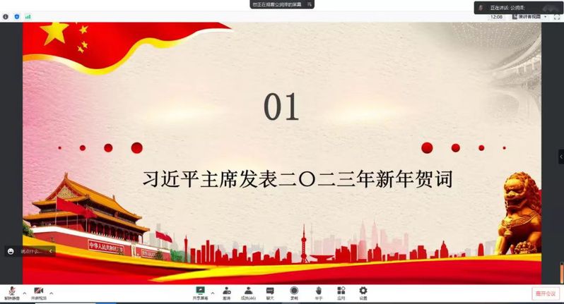 首先,公润泽向大家做了关于《习近平主席二〇二三年新年贺词启示》的学习总结,习近平主席在新年贺词中深情回顾党和人民走过的极不平凡征程,鲜明宣示把新时代中国特色主义事业不断推向前进的坚定决心和必胜信心,号召全党全国各族人民团结奋斗,共创美好未来。