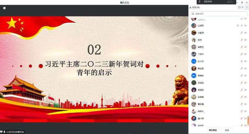 名媛直播 研究生会在2月17日进行了主题为“学习习近平主席2023年新年贺词”的线上红色宣讲活动。本次红色宣讲活动由名媛直播 西海岸校区研究生会副主席公润泽主讲,研究生会全体骨干参与宣讲学习。